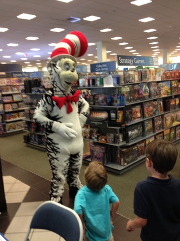 We were lucky enough to find out about a very cool FREE event a couple weeks ago - brunch and story time with the Cat in the Hat! Anson is a HUGE fan, and we all love Dr. Seuss, so we had to go. The boys loved it, but Camille was deathly afraid of the Cat (a first for any of my kids to be scared of any strange creature)!